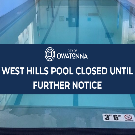 OWATONNA, Minn., Feb. 26, 2026 – The City of Owatonna Parks and Recreation Department announces that the West Hills Pool is closed until further notice.